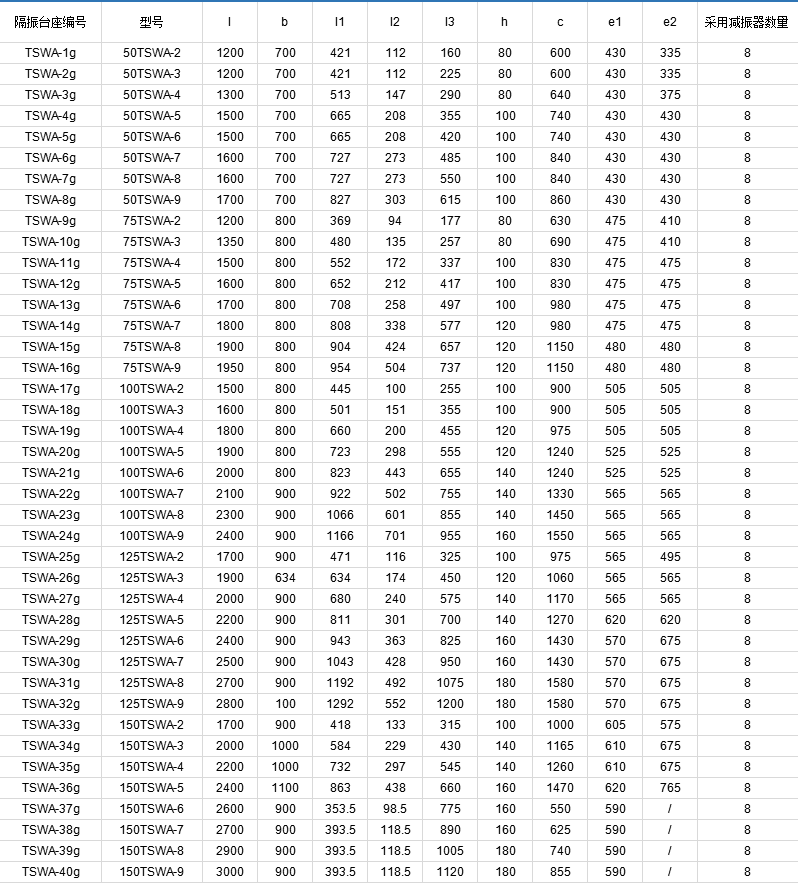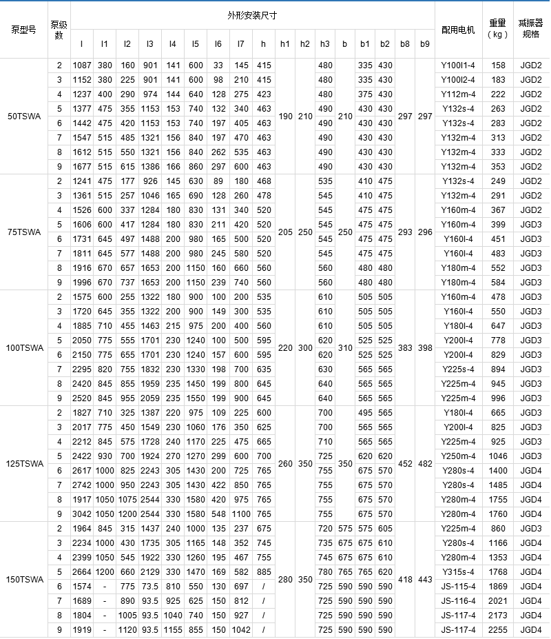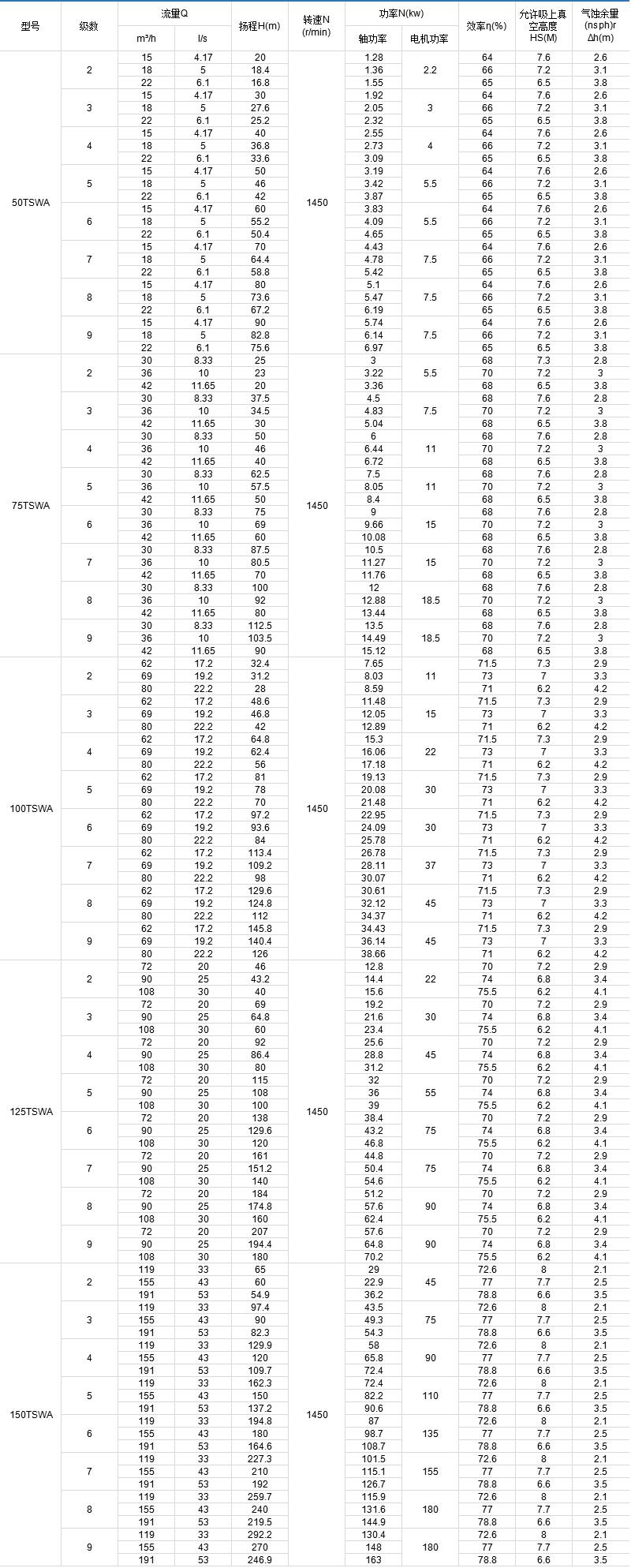 TSWA型多級離心泵全系列共5個品種40個規(guī)格,其性能范圍流量Q=1.5~191m3/h,揚程h=17~247m,轉速n=1450r/min。